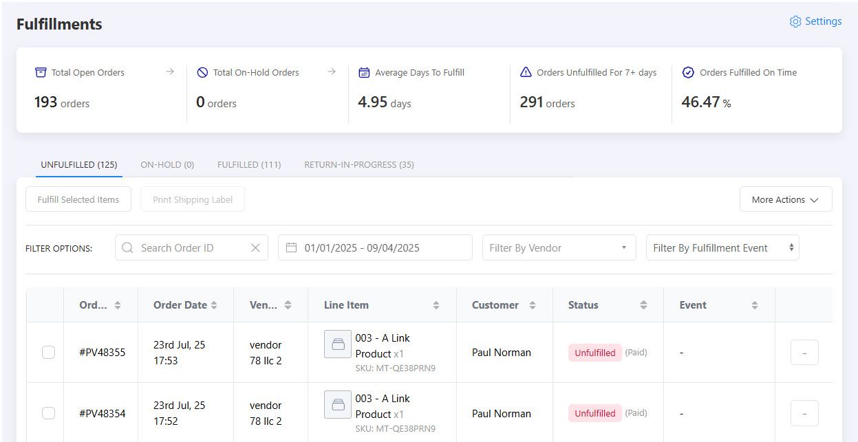 Empower vendors to self-serve while maintaining fulfillment flow visibility across your marketplace.